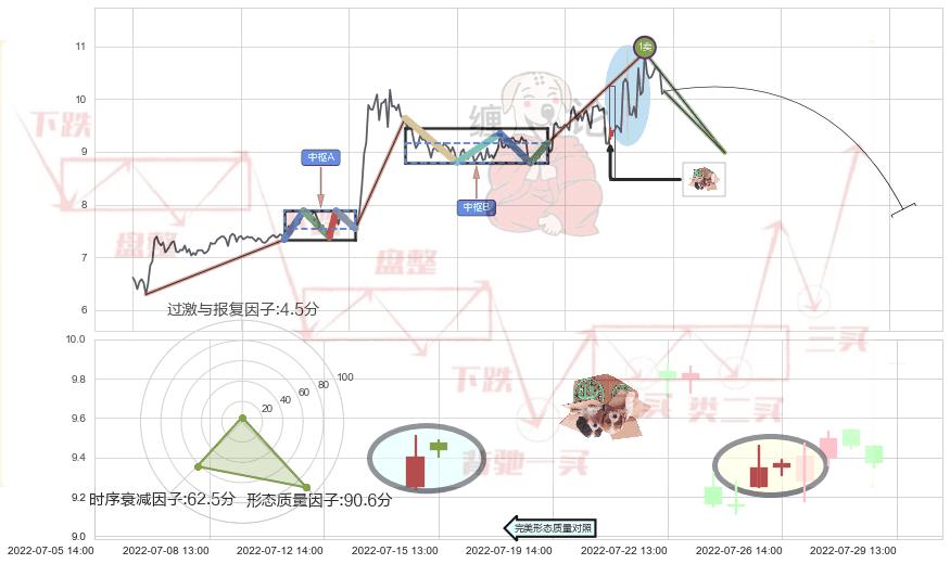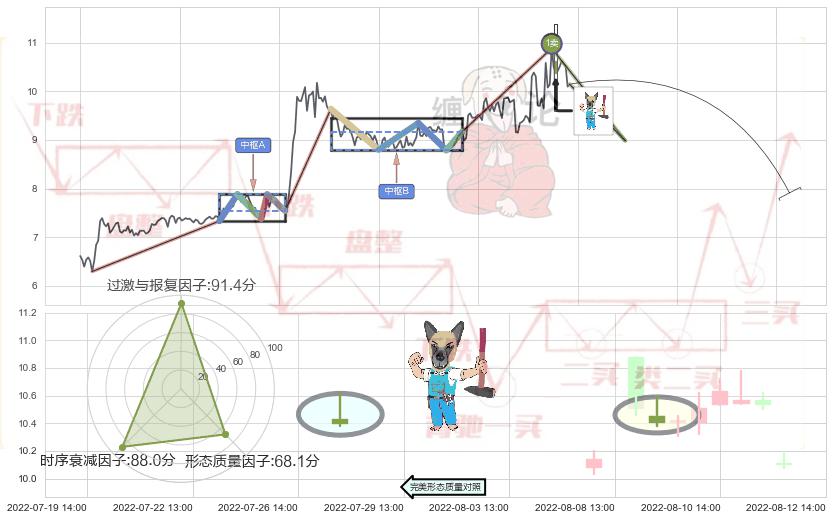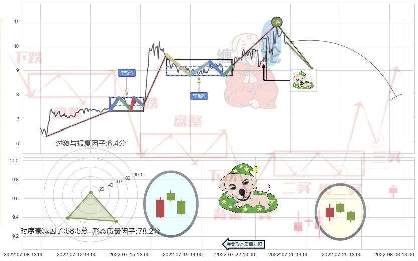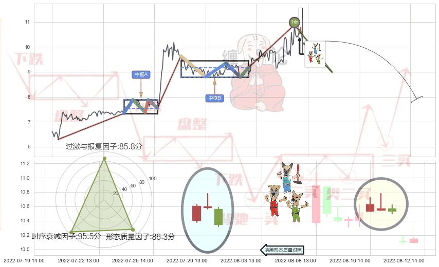 从2022-06-29 14:00至2022-08-12 14:00,共包含63个小时,阶段股价上涨16.80%,阶段股价变动位移路程比: 1 : 6,2022-07-29 13:00向⇪形成缺口,跳空上涨+10.03%