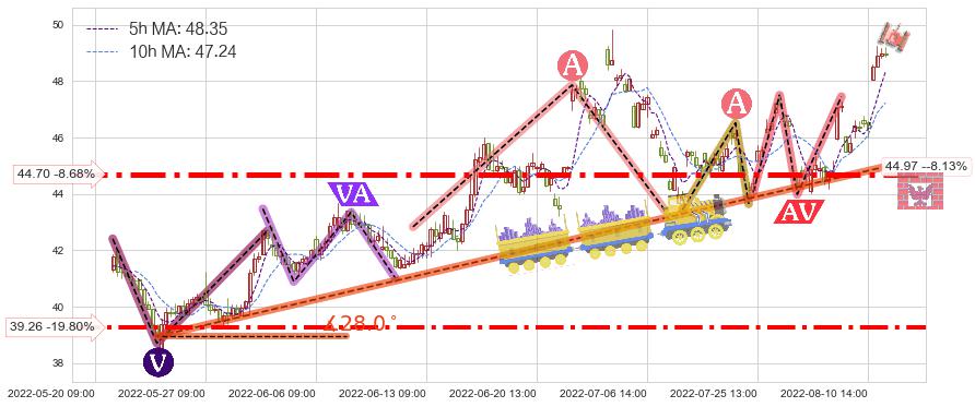 ♘ 支撑价格位44.70,可信任强度92.63%,距离最后交易2022-08-12 14:00形成的收盘价格48.95相差 -8.68%