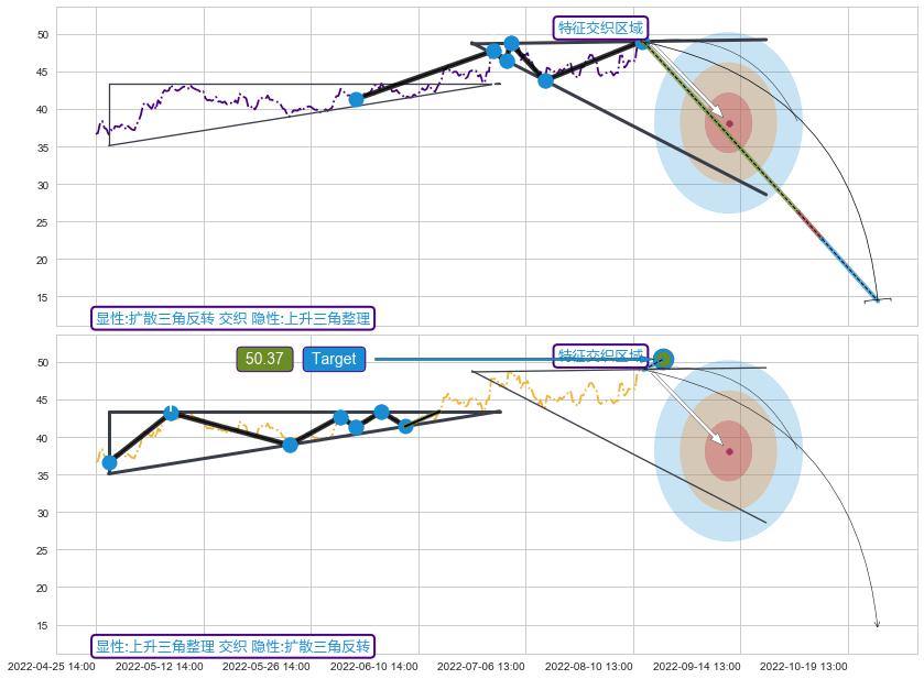 ➢ 上升三角整理临近target阻力拐点下跌 🔜 扩散三角反转临近支撑猜想转换阻力下跌 综合量化分数:47.65 【中性】