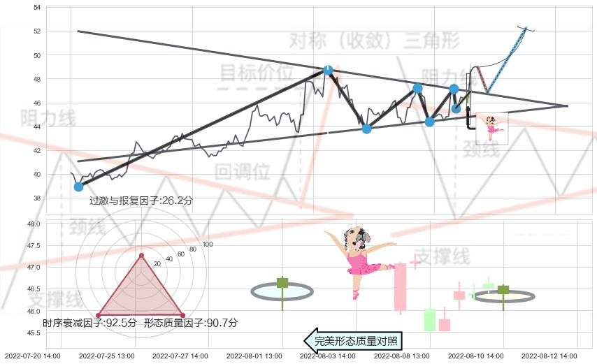 ➣ 【多空双方观望→争持→促使价格波动日益狭窄→多方打破攻守平衡点】对称三角形中继整理, 已在08-11:13突破【阻力】颈线 46.91 →演变成上升通道