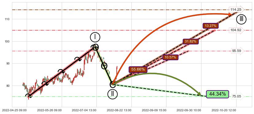 ➢ 大趋势走坏(跌破5浪起点位置)概率44.34%