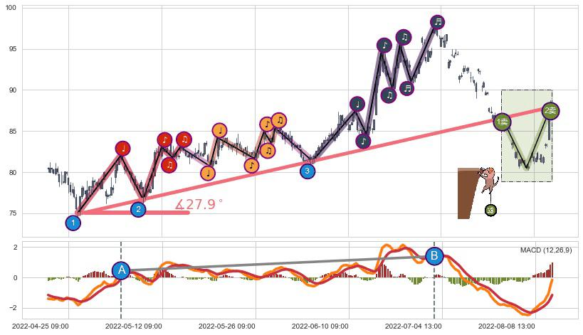 从2022-06-02 13:00至2022-07-15 13:00,共包含91个小时,阶段股价上涨11.65%,阶段股价变动位移路程比: 1 : 6,上涨趋势角度: 62.3