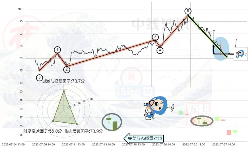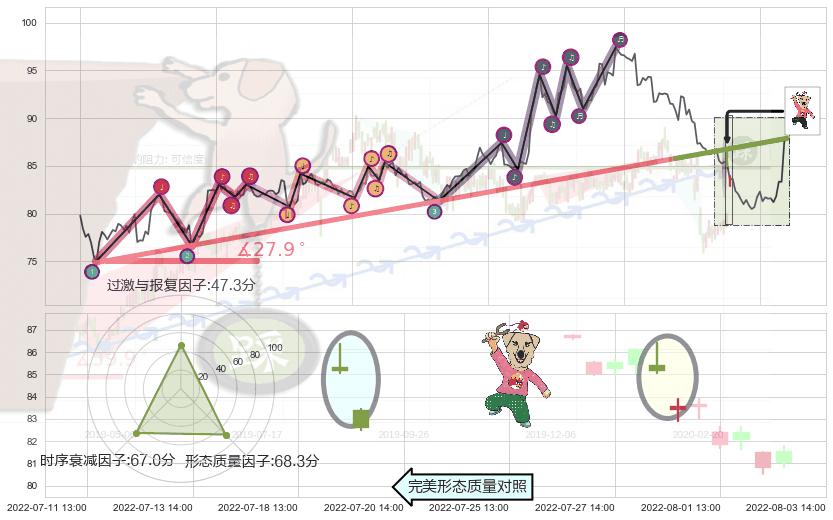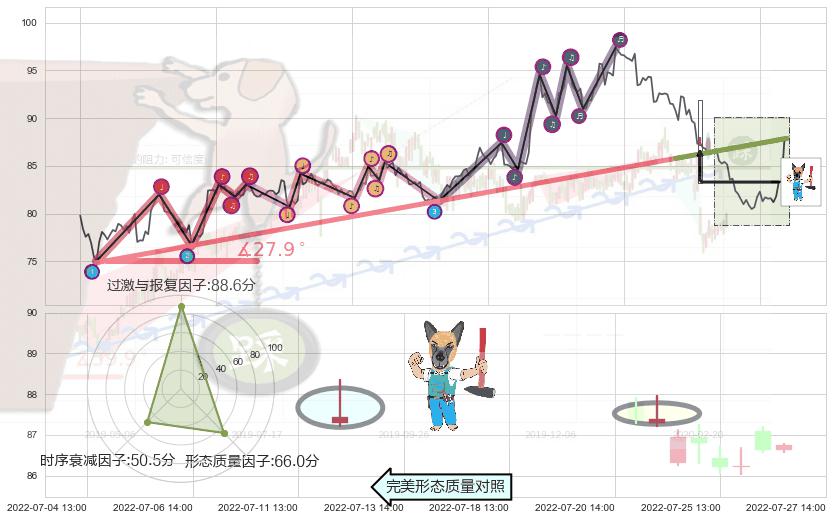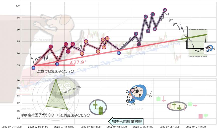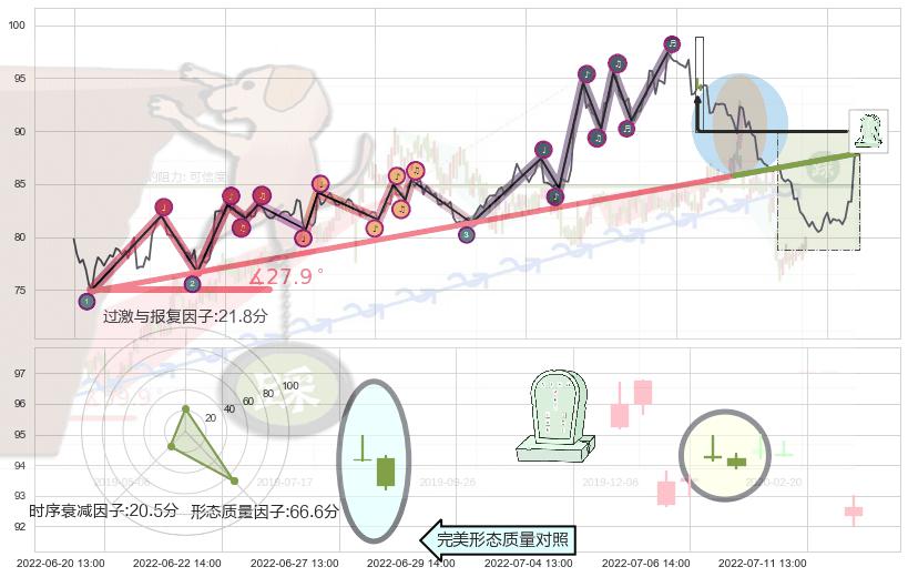 ➢ 2022-04-26 09:00-2022-07-15 13:00上升趋势存在反转[风险],虽然原上升趋势的支撑位(87.89)已破位,但其支撑效果尚存,原上升趋势角度: 27.9˚