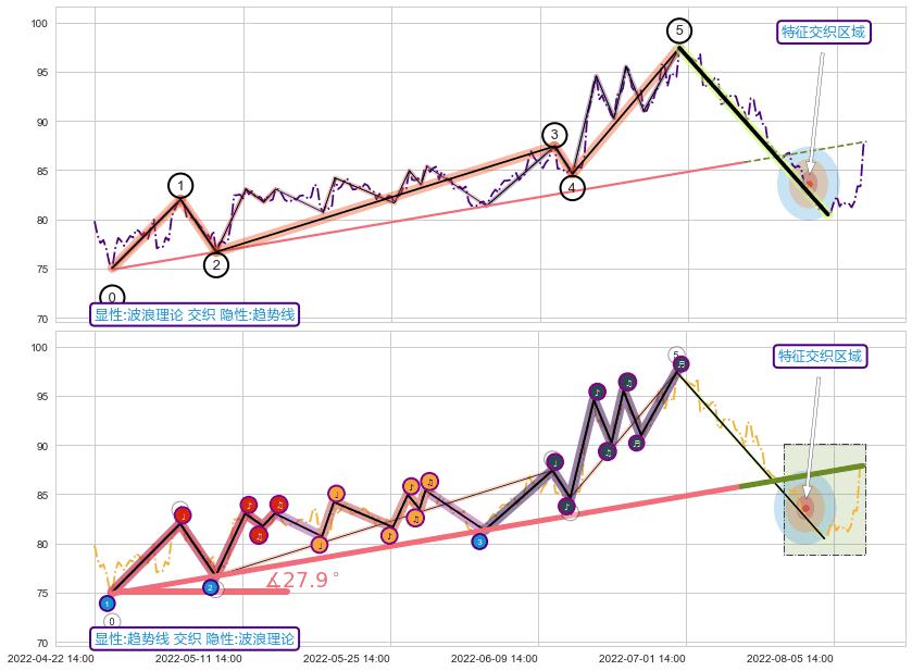 从2022-04-26 09:00至2022-05-16 09:00,共包含56个小时,阶段股价上涨10.53%,阶段股价变动位移路程比: 1 : 4