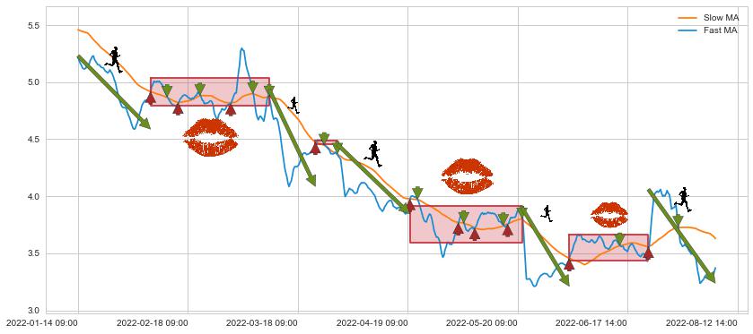 03-10 14:00至03-23 10:00 慢线与快线呈空头排列, 慢线与快线接触少,无缠绕