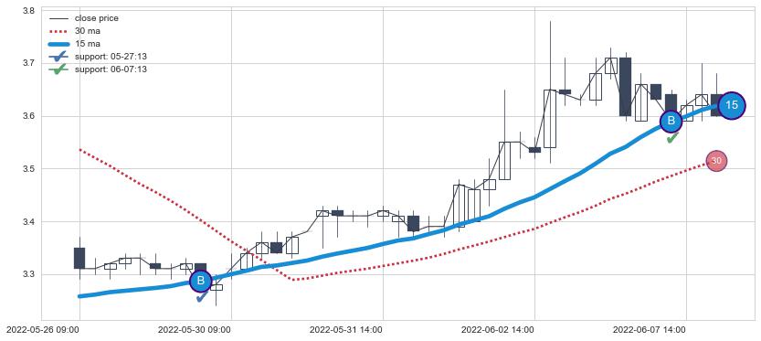 📝 多条均线形成死叉后走势最低价格达到: 3.210