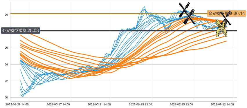 ➢ 13小时均线于(08-09 13:00: 28.13)形成【金叉】基于【金叉历史模型】预测金叉后最高波峰价格: 29.44, 金叉后最高价格29.78,已经上涨超出预测最高波峰价格, 预期回调
