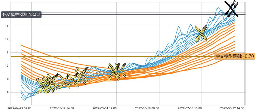 ➣ 10小时均线于(08-11 13:00: 14.16)形成【死叉】基于【死叉历史模型】预测死叉后最低波谷价格: 13.85, 死叉后最低价格14.17,已经下跌超出预测最低波谷价格, 预期反弹
