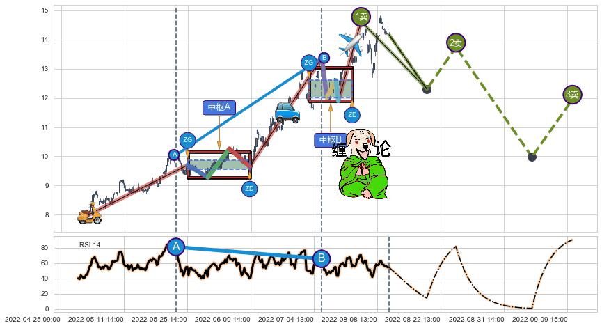 ➣ 缠论买卖点:上升缠中枢AB形成后猜想拐点1卖已到达,猜想后续持续下跌(均值回复)