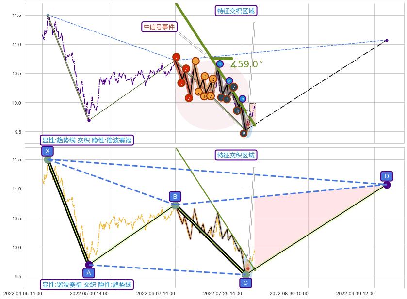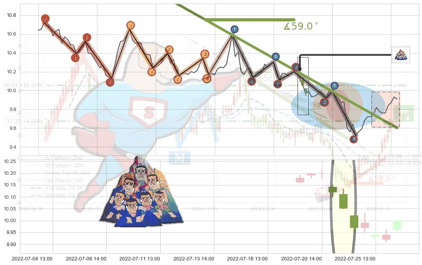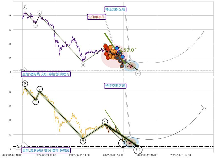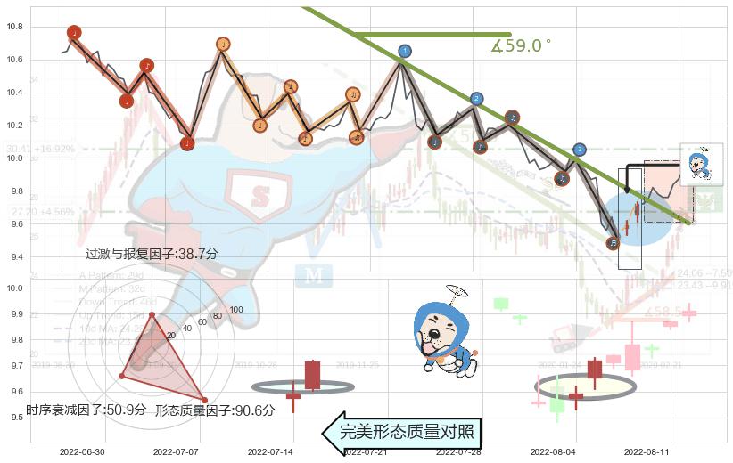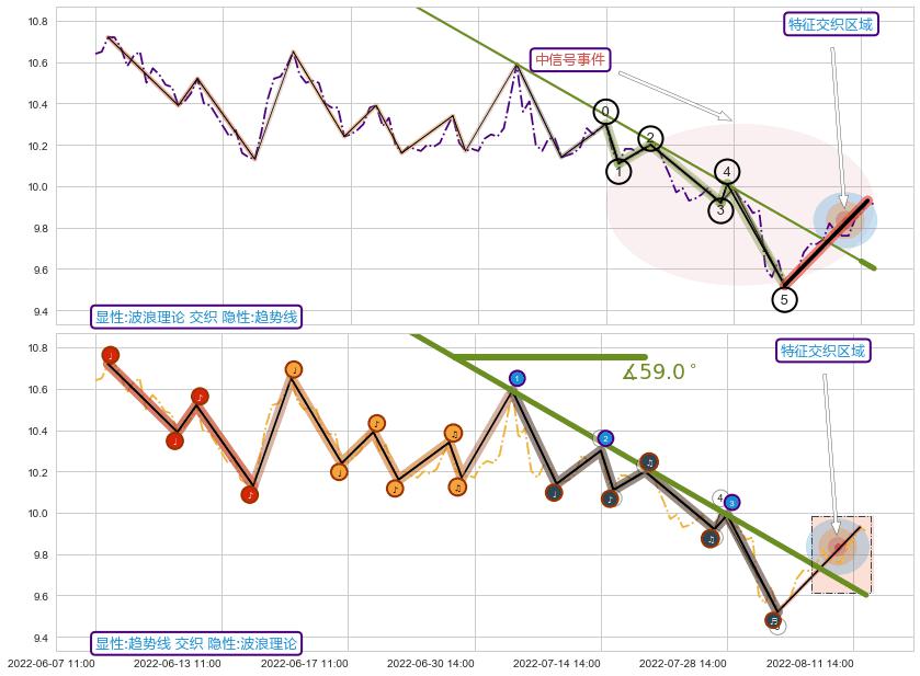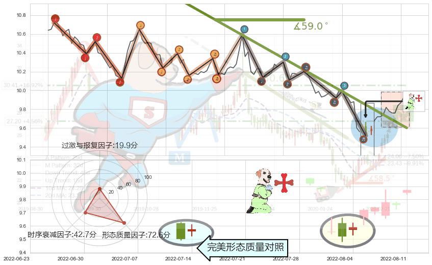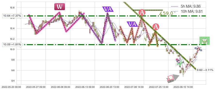 ➢ 2022-06-07 14:00-2022-08-11 14:00下跌趋势存在反转上涨[机会],其原下跌趋势的阻力位(9.60)已被突破[强支撑信号],原下跌趋势角度: 59.0˚