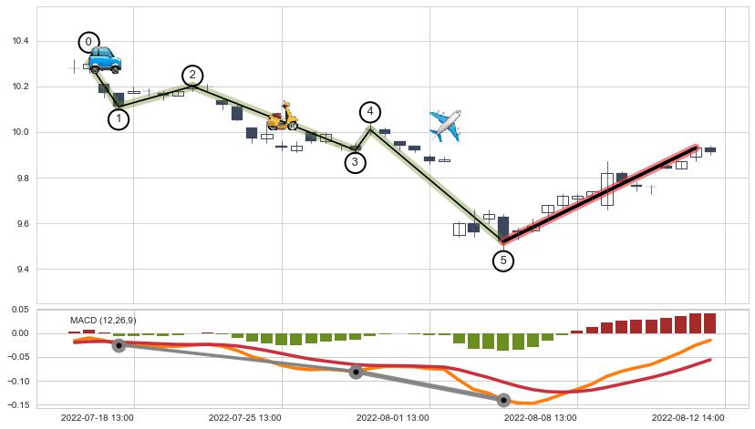 ➣ 趋势线:阻力位已击穿突破,猜想持续向上拉升上涨 → 上涨 →【突破】机会信号 → 大周期均值回复