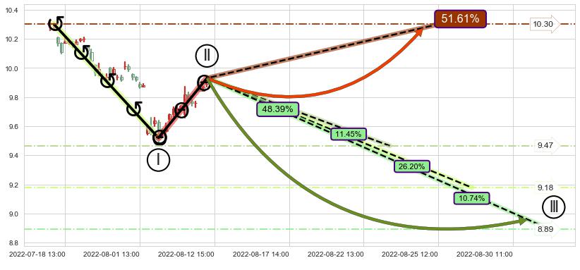 ➢ 循环浪继续向下【最低】位置(08-31:14, 8.89),匹配聚类样本比例22.19%, 可能性概率10.74%