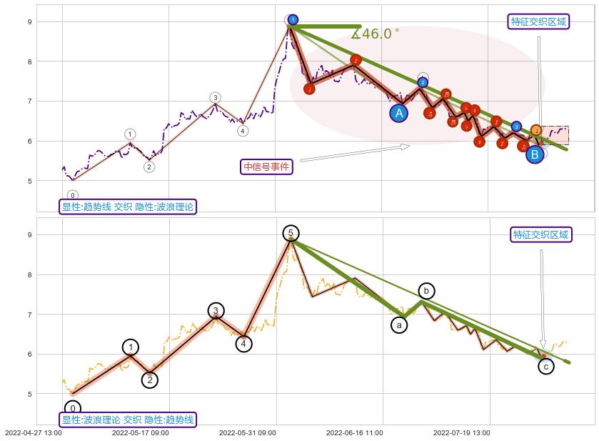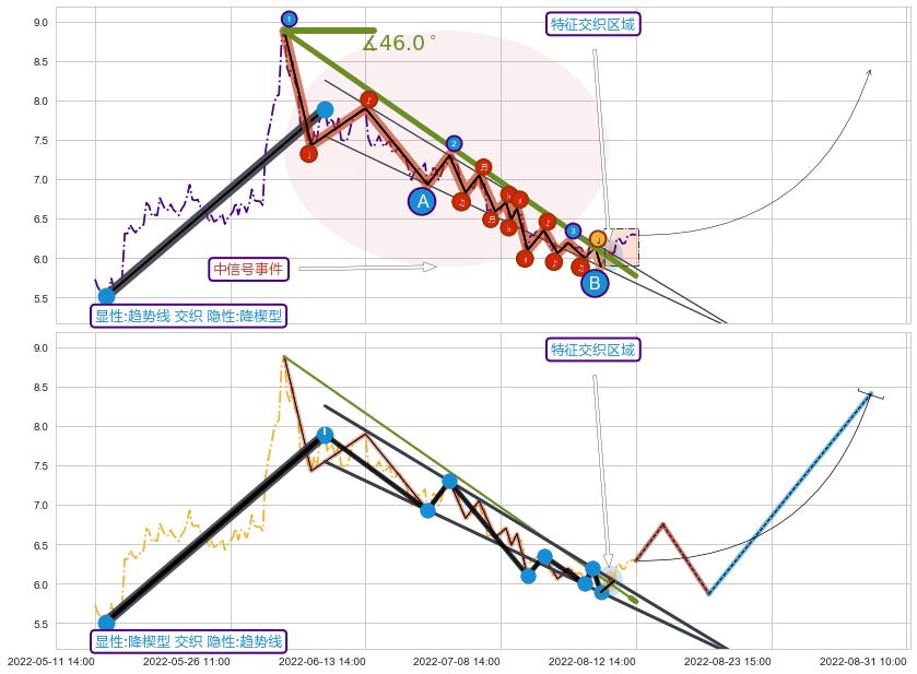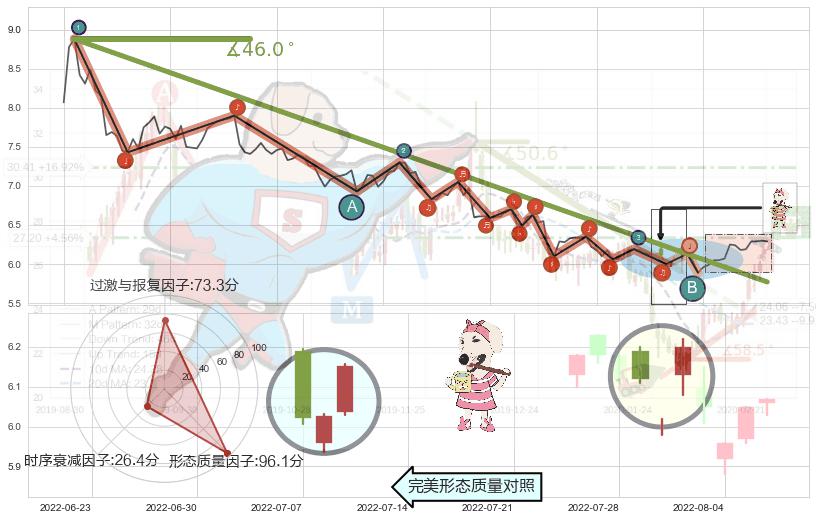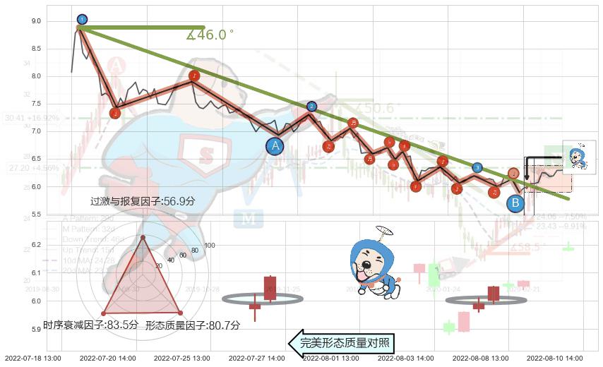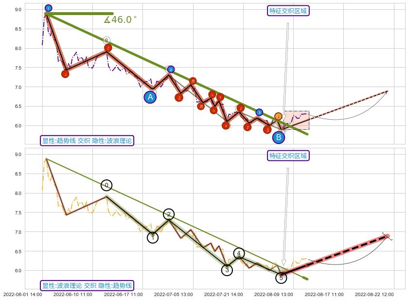 ➢ 2022-06-02 10:00-2022-08-11 14:00下跌趋势存在反转上涨[机会],其原下跌趋势的阻力位(5.77)已被突破[强支撑信号],原下跌趋势角度: 46.0˚