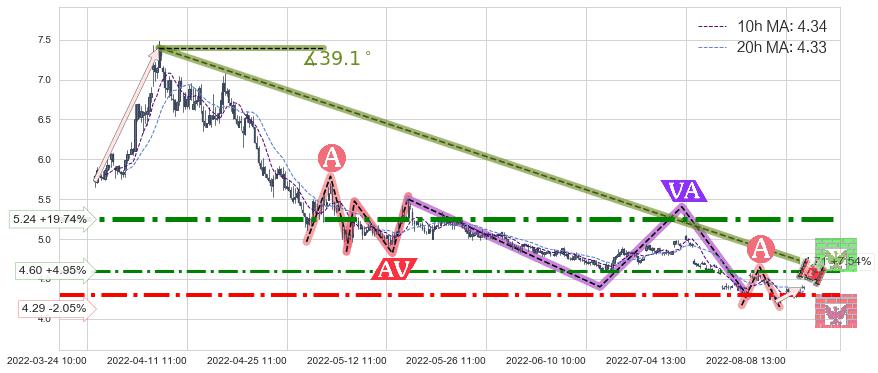 ♘ 在最后的下跌阶段2022-04-06 13:00至2022-08-12 13:00,存在 持续未破位的阻力位 ,阻力价格4.71,可信任强度85.26%,其距离最后价格4.38相差 +7.54%