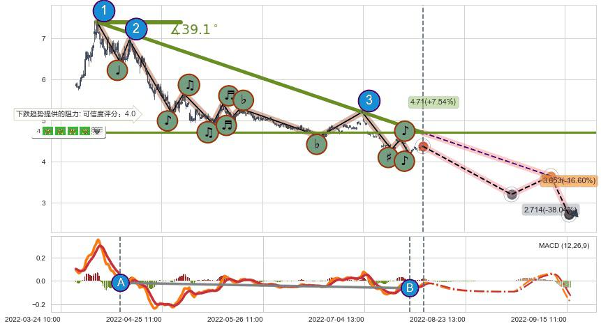 ♘ 阻力价格位4.60,可信任强度64.83%,距离最后交易2022-08-12 14:00形成的收盘价格4.38相差 +4.95%
