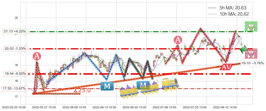 ♘ 支撑价格位20.02,可信任强度84.67%,距离最后交易2022-08-12 14:00形成的收盘价格20.27相差 -1.23%