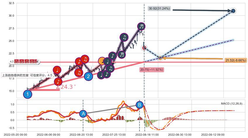 ♘ 支撑价格位18.61,可信任强度92.10%,距离最后交易2022-08-12 14:00形成的收盘价格23.56相差 -21.00%