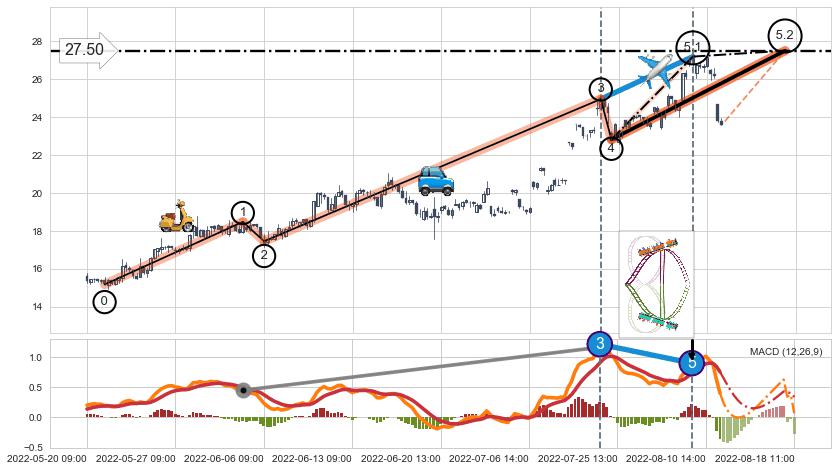 ➣ 5.1: 预测当前第5浪位置(08-08:14, 27.19),仍然有上升空间