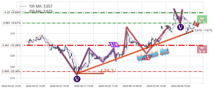♘ 阻力价格位3.981,可信任强度54.73%,距离最后交易2022-08-12 14:00形成的收盘价格3.880相差 +2.61%