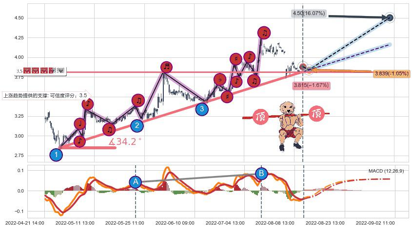 ♘ 阻力价格位4.22,可信任强度55.18%,距离最后交易2022-08-12 14:00形成的收盘价格3.880相差 +8.69%