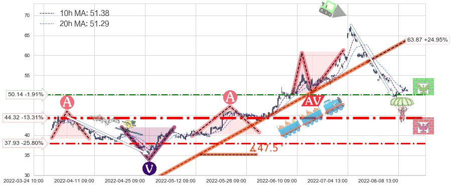 ♘ 阻力价格位50.14,可信任强度46.80%,距离最后交易2022-08-12 14:00形成的收盘价格51.12相差 -1.91%