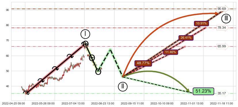 ➣ 高概率大级别循环上涨浪被破坏,反转向下(突破5浪起点)概率51.23%
