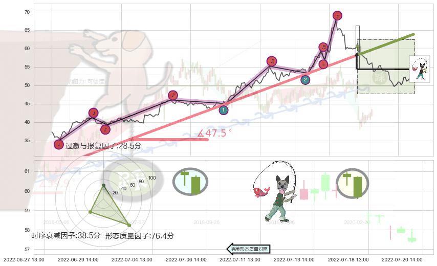 ➣ 2022-04-25 14:00-2022-07-18 13:00上升趋势存在反转[风险],其原上升趋势的支撑位(63.87)已破位[强阻力信号],原上升趋势角度: 47.5˚