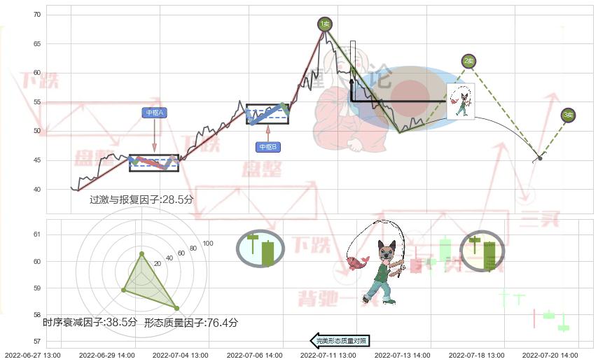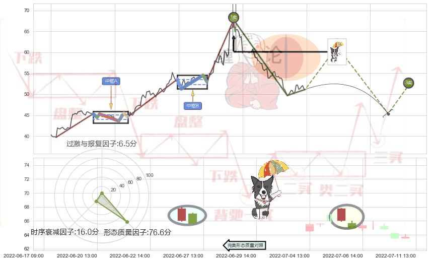 ➢ 2022-04-25 14:00-2022-07-18 13:00上升趋势存在反转[风险],其原上升趋势的支撑位(63.87)已破位[强阻力信号],原上升趋势角度: 47.5˚