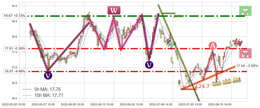 ♘ 阻力价格位18.67,可信任强度98.25%,距离最后交易2022-08-12 14:00形成的收盘价格17.66相差 +5.73%