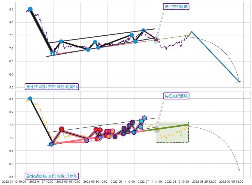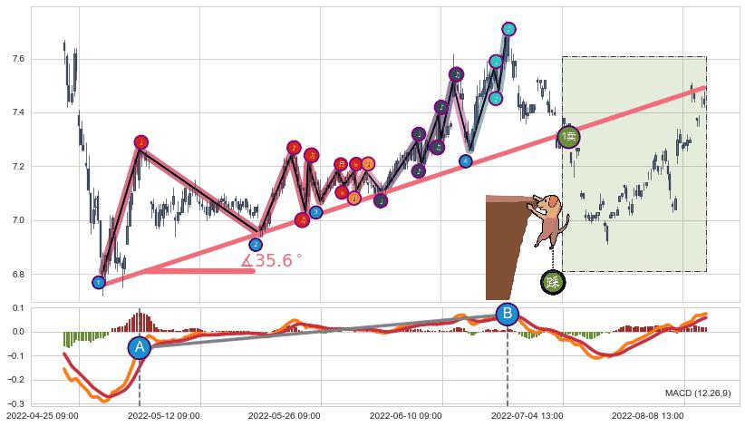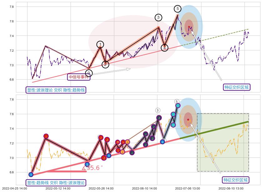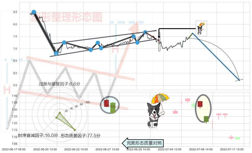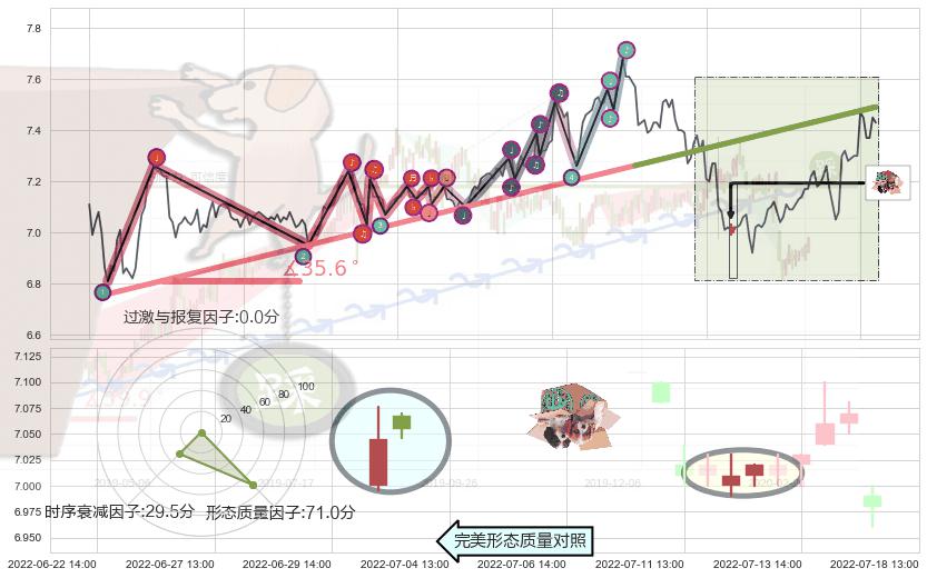 ➣ 2022-04-27 09:00-2022-06-20 14:00上升趋势存在反转[风险],虽然原上升趋势的支撑位(7.49)已破位,但其支撑效果尚存,原上升趋势角度: 35.6˚
