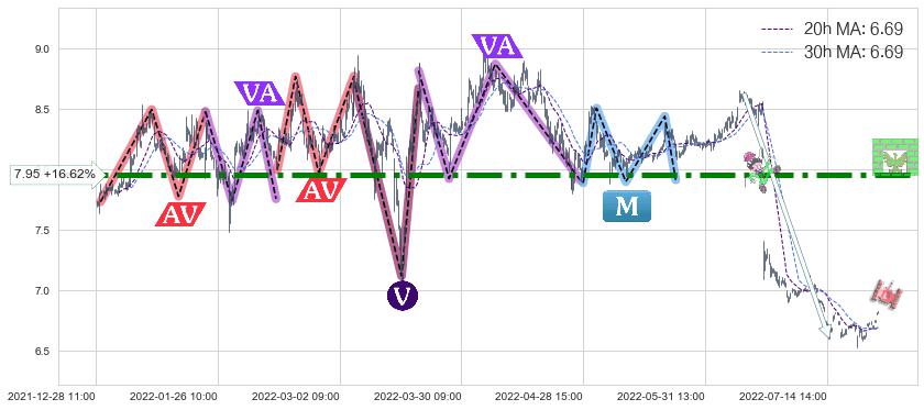 2022-05-25: 时域附近第一阻力位7.95持续的对下跌趋势进行阻拦,有效地放缓了下跌的速度。