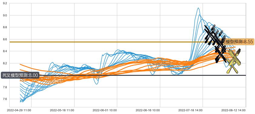 ➣ 30小时均线于(07-22 14:00: 8.71)形成【死叉】基于【死叉历史模型】预测死叉后最低波谷价格: 8.40, 死叉后最低价格8.06,已经下跌超出预测最低波谷价格, 预期反弹
