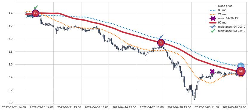 03-21 14:00至05-10 09:00 慢线与快线呈空头排列, 慢线与快线接触少,无缠绕