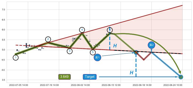 ➢ 最小反转跌幅→𝐇: 1.2185 (逐步抬高阻力斜边最后的阻力点⑥与支撑边垂直距离)