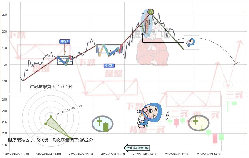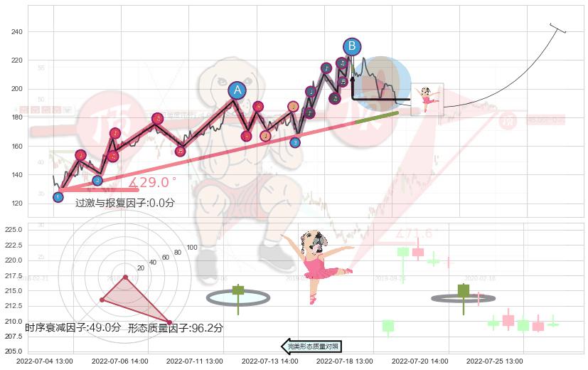 从2022-04-27 09:00至2022-07-22 14:00,共包含219个小时,阶段股价上涨53.82%,阶段股价变动位移路程比: 1 : 5,上涨趋势角度: 29.0,2022-06-30 13:00向⇪形成缺口,跳空上涨+10.00%