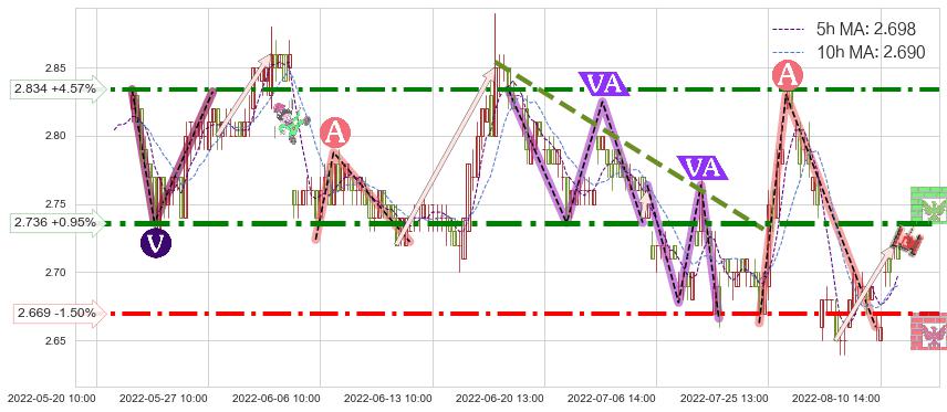 ♘ 阻力价格位2.834,可信任强度81.13%,距离最后交易2022-08-12 14:00形成的收盘价格2.710相差 +4.57%
