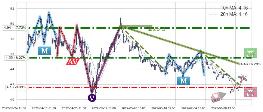 ♘ 阻力价格位4.94,可信任强度96.73%,距离最后交易2022-08-12 14:00形成的收盘价格4.20相差 +17.73%