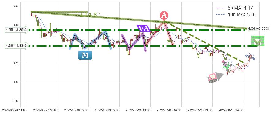 ♘ 阻力价格位4.55,可信任强度94.15%,距离最后交易2022-08-12 14:00形成的收盘价格4.20相差 +8.35%