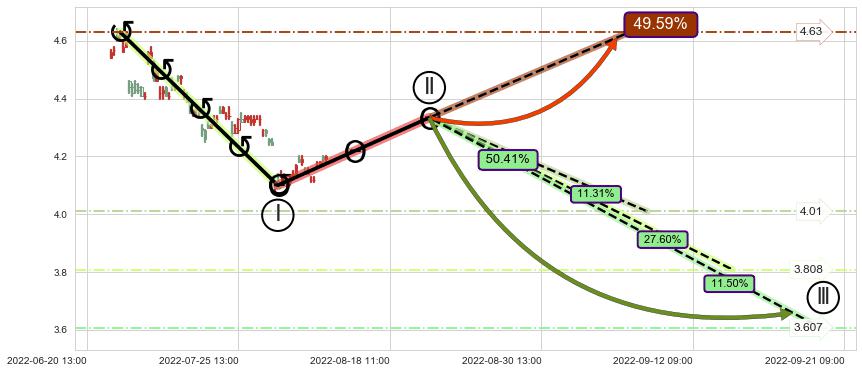 ➢ 循环浪继续向下【最低】位置(09-21:09, 3.607),匹配聚类样本比例22.81%, 可能性概率11.50%