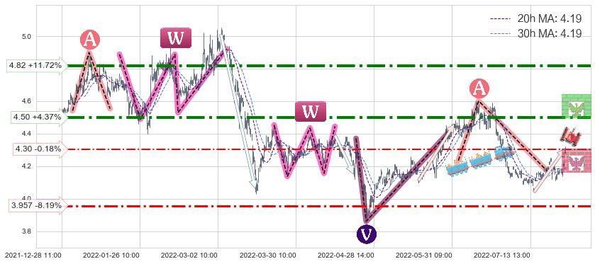♘ 阻力价格位4.50,可信任强度74.62%,距离最后交易2022-08-12 14:00形成的收盘价格4.31相差 +4.37%
