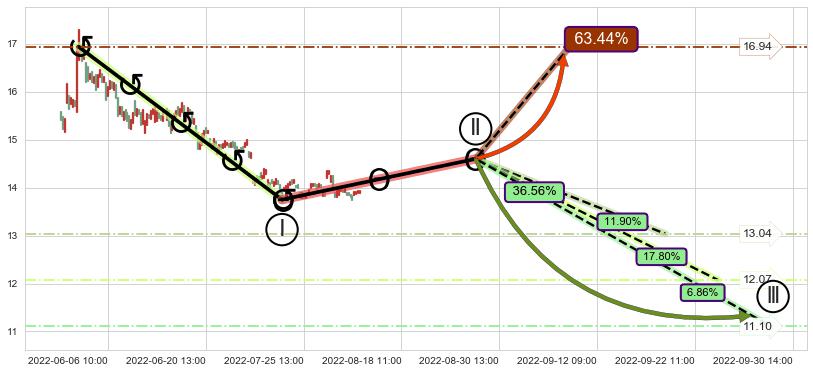 ♘ 阻力价格位15.14,可信任强度87.65%,距离最后交易2022-08-12 14:00形成的收盘价格13.91相差 +8.83%