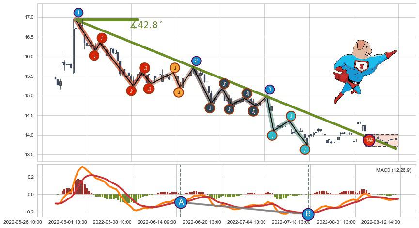 ➣ 2022-05-31 10:00-2022-07-20 13:00下跌趋势存在反转上涨[机会],虽然原下跌趋势的阻力位(13.66)已被突破,但其阻力效果尚存,原下跌趋势角度: 42.8˚