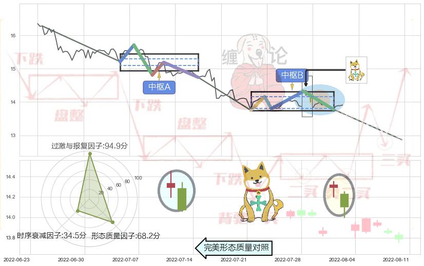 ➣ 【中枢B】:07-15:14-08-10:14,中枢由5笔构成,共37交易小时, ZG=14.16, ZD=13.80