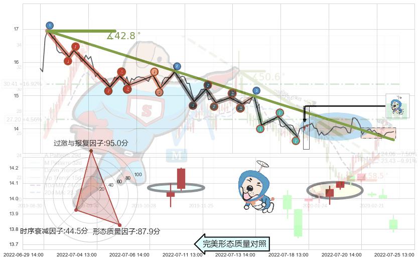 从2022-05-31 10:00至2022-07-20 13:00,共包含110个小时,阶段股价下跌-17.78%,阶段股价变动位移路程比: 1 : 4,下跌趋势角度: 42.8