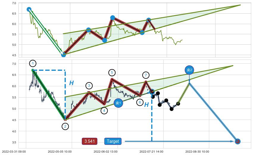 ➢ 最小中继整理跌幅→𝐇: 2.200 (𝐇楔型旗杆的长度:楔型起点→顶点)