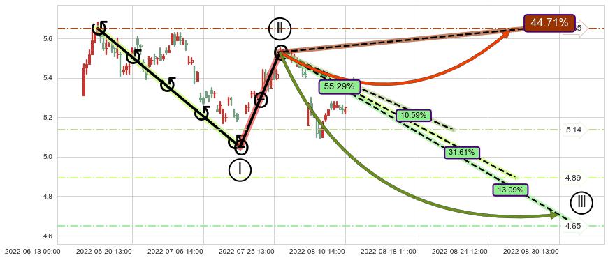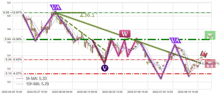 ➣ 2022-05-30 14:00-2022-07-20 14:00下跌趋势存在反转上涨[机会],虽然原下跌趋势的阻力位(5.28)已被突破,但其阻力效果尚存,原下跌趋势角度: 36.1˚