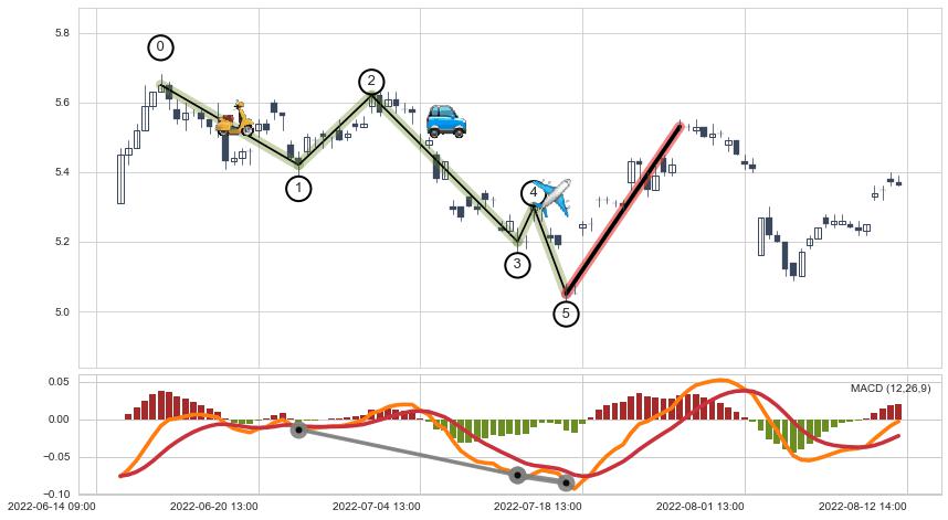 ➣ 趋势线:阻力位已击穿突破,猜想持续向上拉升上涨 → 上涨 →【突破】机会信号 → 大周期均值回复