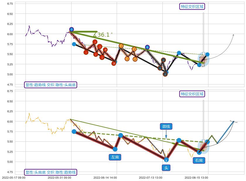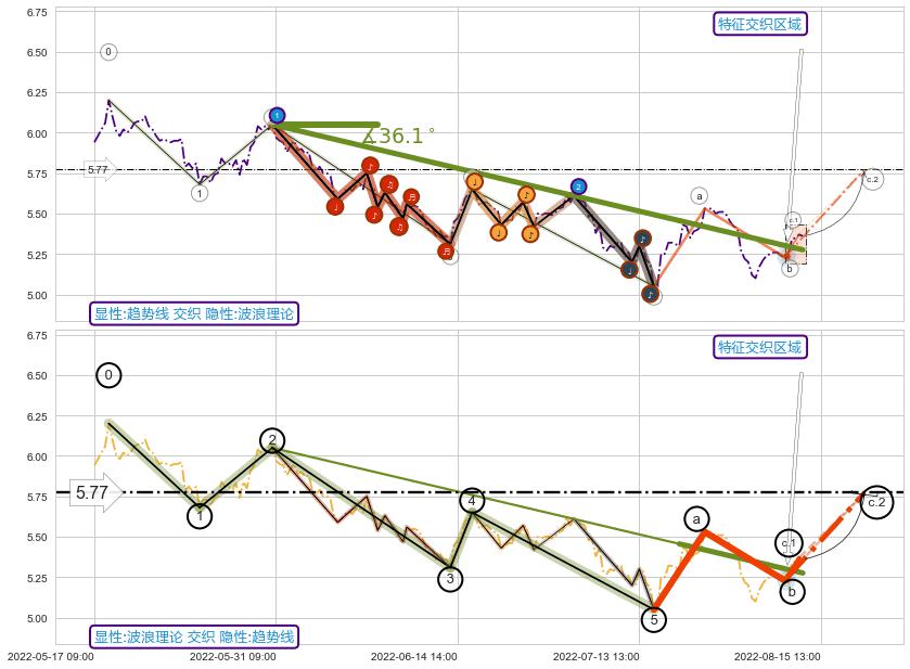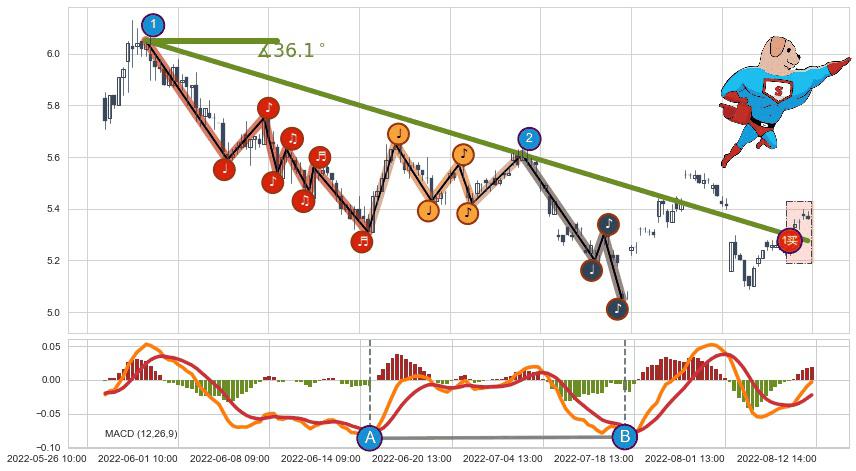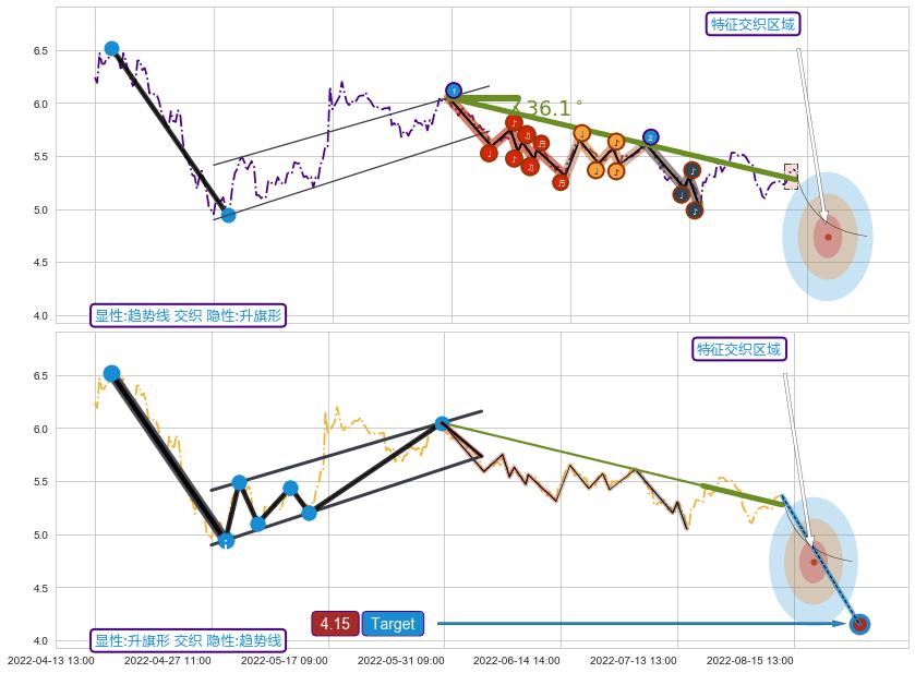 ➢ 2022-05-30 14:00-2022-07-20 14:00下跌趋势存在反转上涨[机会],虽然原下跌趋势的阻力位(5.28)已被突破,但其阻力效果尚存,原下跌趋势角度: 36.1˚