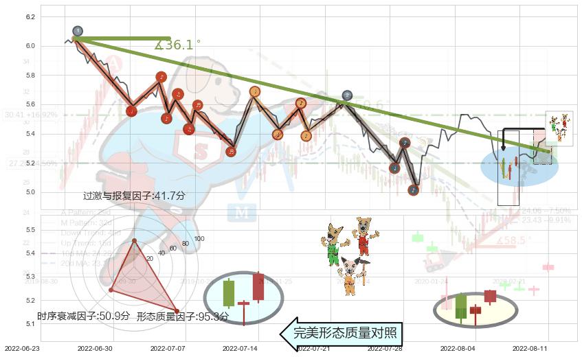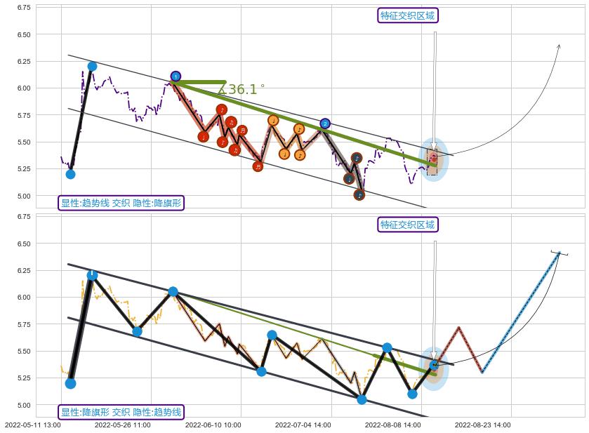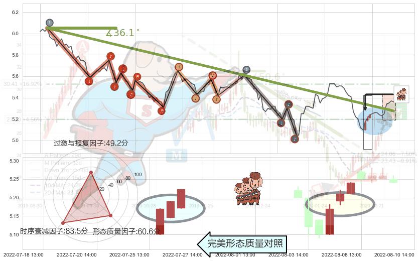 从2022-05-30 14:00至2022-07-20 14:00,共包含113个小时,阶段股价下跌-12.66%,阶段股价变动位移路程比: 1 : 6,下跌趋势角度: 36.1