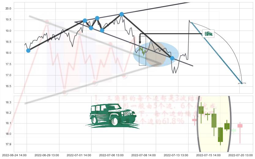 从2022-07-04 14:00至2022-07-20 14:00,共包含25个小时,阶段股价下跌-5.82%,阶段股价变动位移路程比: 1 : 3,2022-07-12 13:00向↘︎形成缺口,跳空下跌-3.62%˚